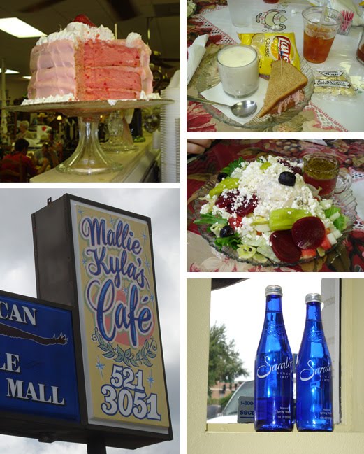 We had lunch with the family at Mallie Kyla's Cafe in Dade City (a cute little antiquing town). They always have a couple of huge cakes-of-the-day on display, like the strawberry one pictured, and a ton of blue glass bottles on the tables and in the windows. Also pictured are a hot ham and swiss sandwich and cup of swiss potato soup, and a greek salad.